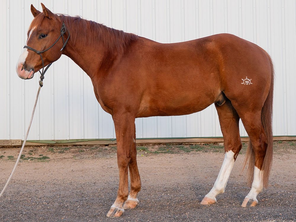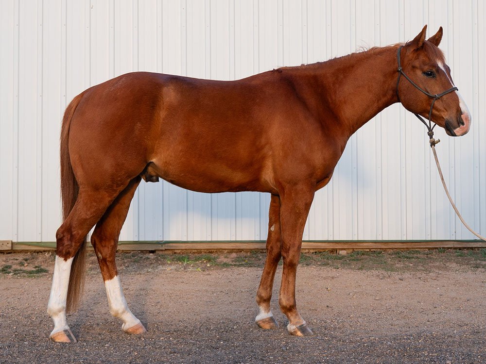 Daughter of Sweetshot Playgun, who is arguably the most well known son of the great Playgun. Sweetshot has earned 18 AQHA Points, (3.5 in open Heading, 2.5 open heeling) He is the sire of 80 AQHA money earners. Out of Sweet Little Lena by Smart Little Lena (earner of $124,843).
